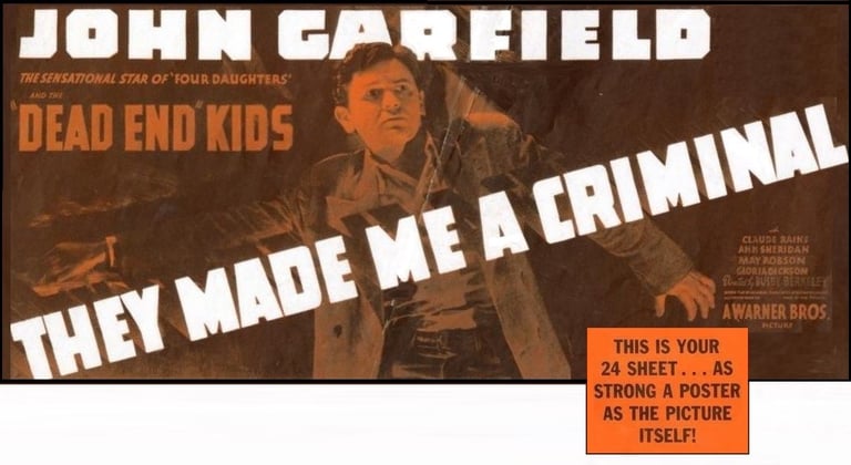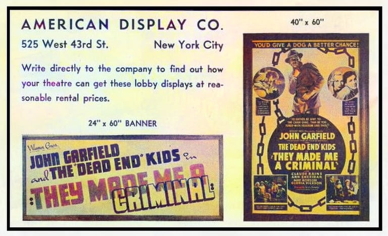 American Display Company was a company based in New York City and from 1936 to roughly 1941, this company printed its own one-sheets and lobby card sets (and a very few inserts, half-sheets, three-sheets, 40x60s and stills) for three major studio movies (Warner Brothers, Paramount and United Artists, but no other studios). The items almost always feature a tiny legal disclaimer and cast credits only. The posters and lobby cards are from the original release of the movie, and almost always have completely different artwork from the regular studio release. Before it was discovered by noted poster dealer/historian Walter Reuben, collectors did not know the name of this company (and thought it to be located in the Midwest), and it is often referred to as the "other company" (and we will continue to refer to it that way, since collectors know it that way).