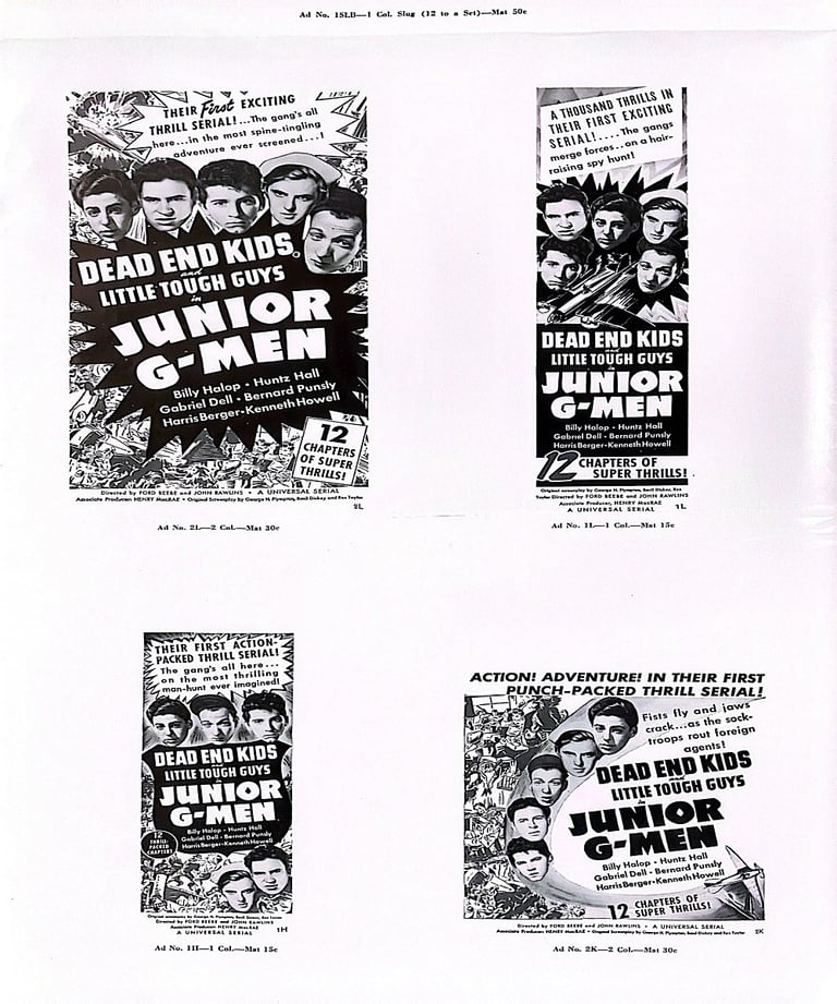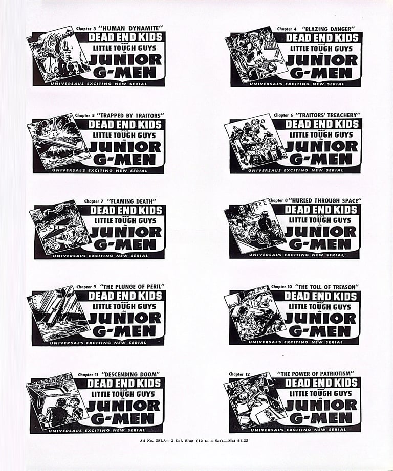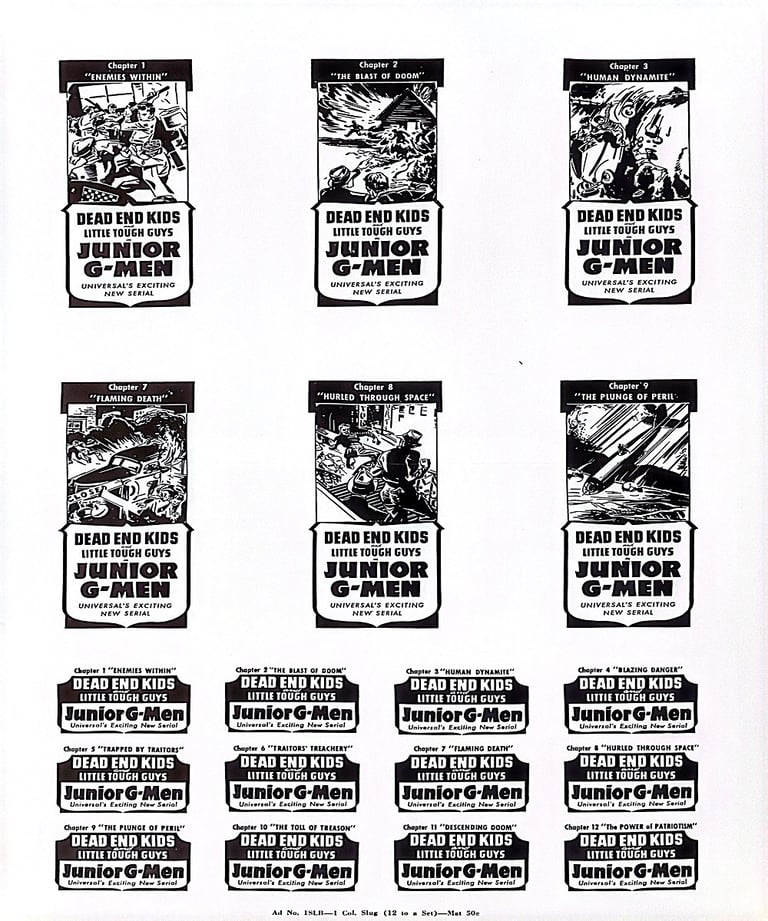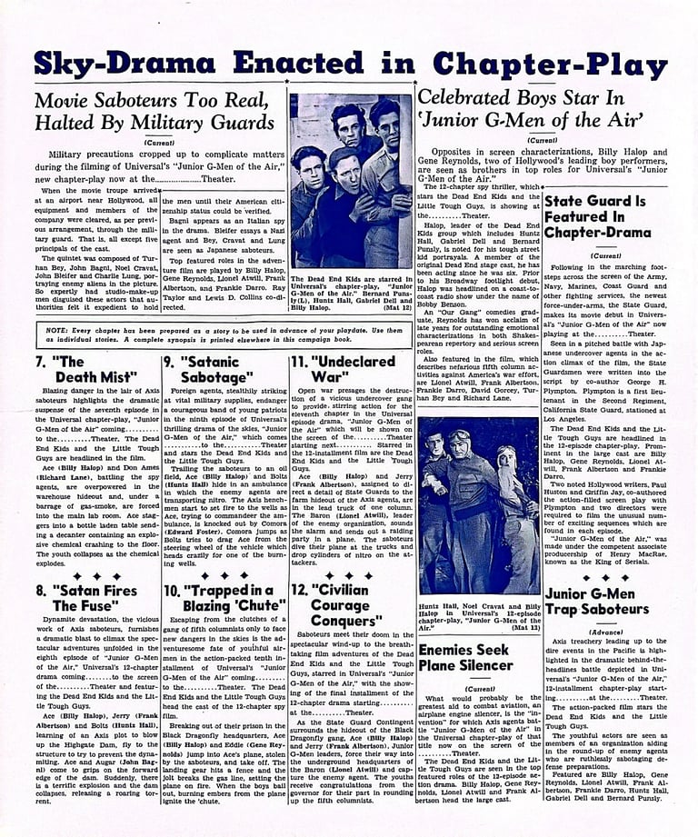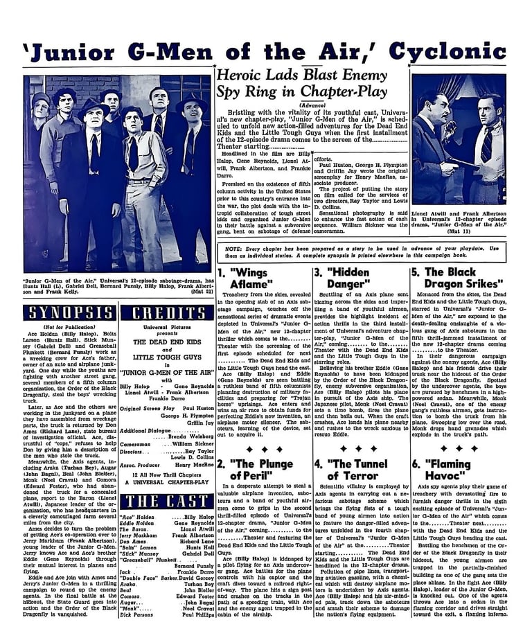 Junior G-Men of the Air is a 1942 Universal film serial. It was Universal's 55th with sound and one of the three serials starring "The Dead End Kids and Little Tough Guys" who were under contract to Universal at the time. This was the teen stars' third and final serial, after Junior G-Men (1940) and Sea Raiders (1941). The plot of Junior G-Men of the Air is when a group of youthful flying enthusiasts join the "Junior G-Men" to help break up a planned attack on the United States.
