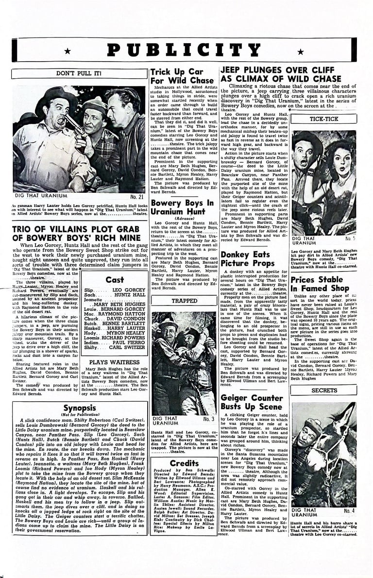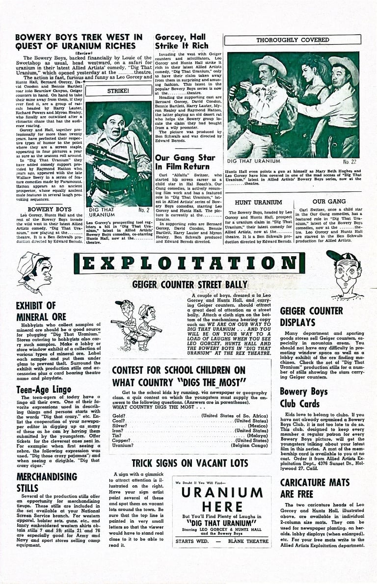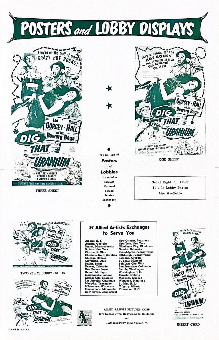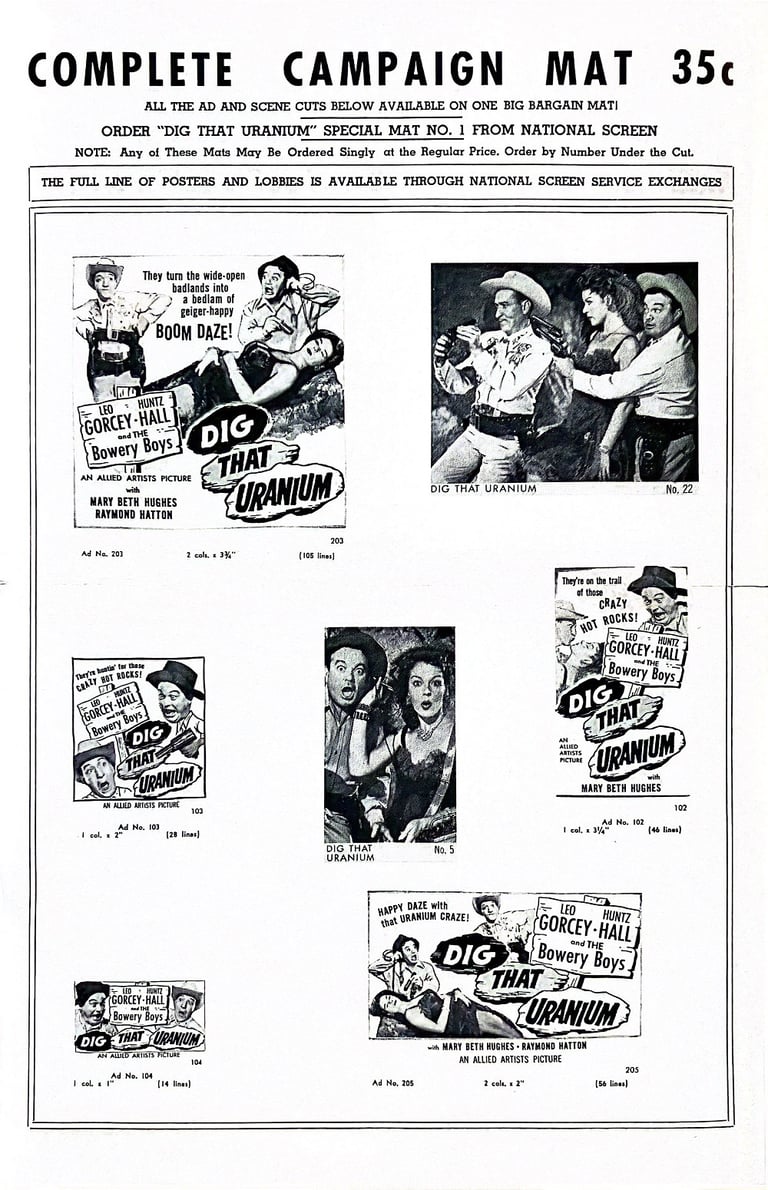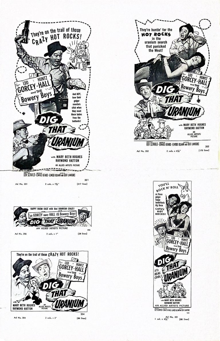 Dig That Uranium is a 1956 American comedy film directed by Edward Bernds and starring the comedy team of The Bowery Boys, Raymond Hatton and Mary Beth Hughes. The film was released on January 8, 1956, by Allied Artists and is the fortieth film in the series.