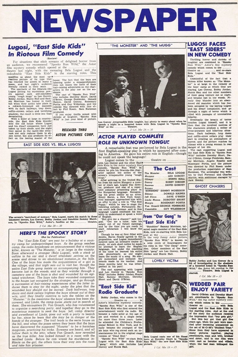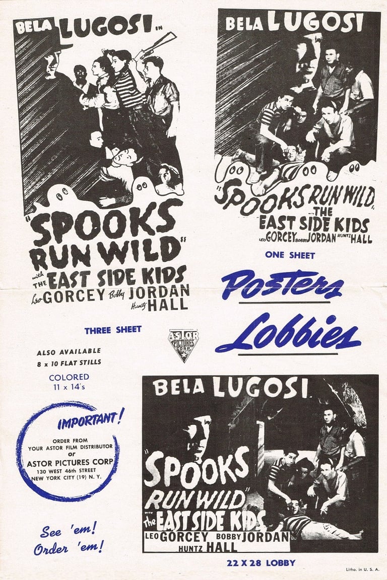 Spooks Run Wild is a 1941 American horror comedy film and the seventh film in the East Side Kids series. It stars Bela Lugosi with Leo Gorcey, Bobby Jordan and Huntz Hall.[1] It is directed by Phil Rosen, in his first and only outing in the series, and produced by Sam Katzman (under the company name Banner Pictures). The original script is by Carl Foreman and Charles R. Marion.