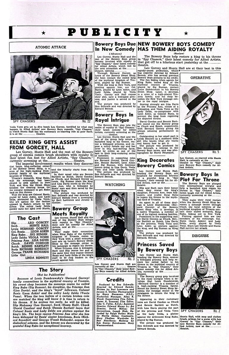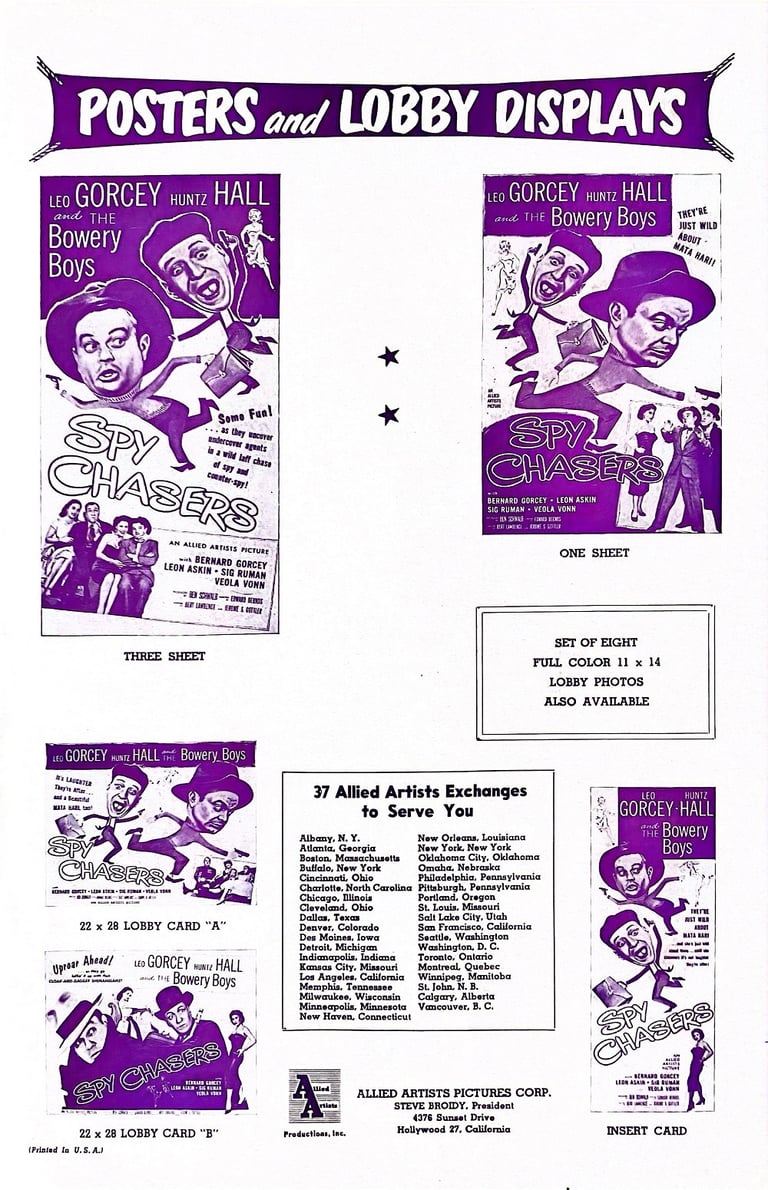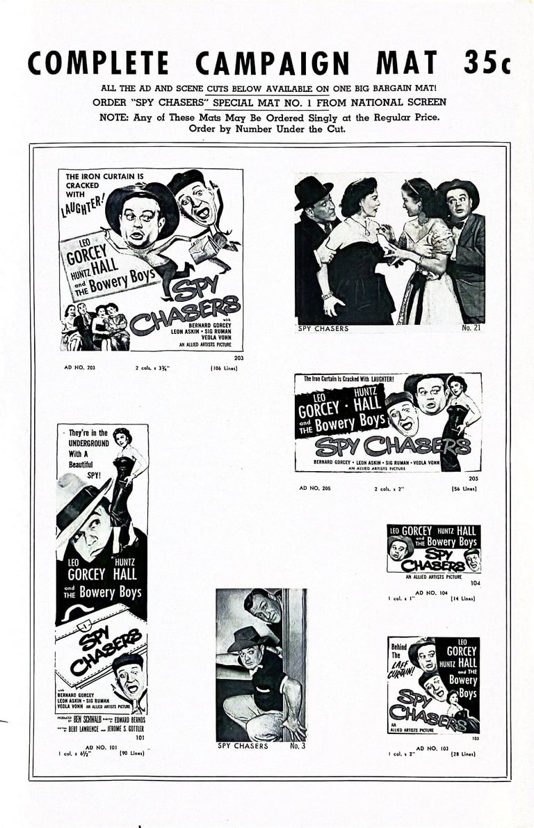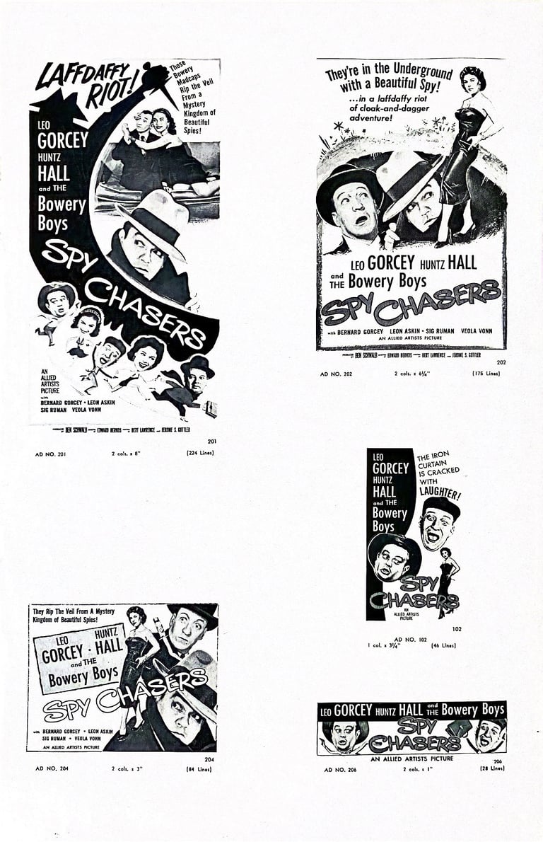 Spy Chasers is a 1955 American comedy film directed by Edward Bernds and starring the comedy team of The Bowery Boys. The film was released on July 31, 1955 by Allied Artists and is the thirty-eighth film in the series.