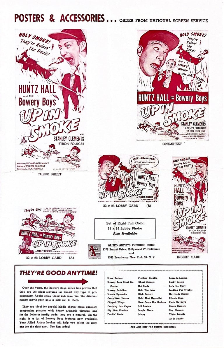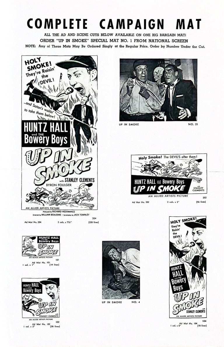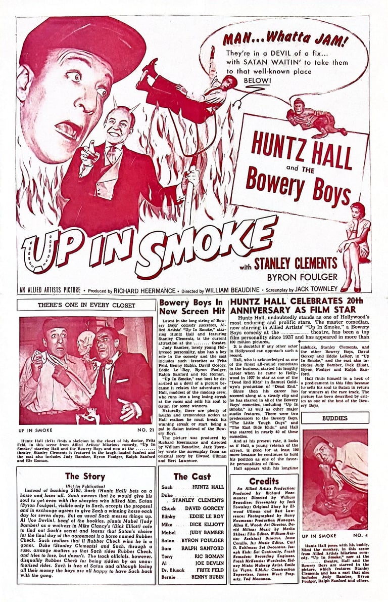 Up in Smoke is a 1957 American comedy film directed by William Beaudine and starring the comedy team of The Bowery Boys. The film was released on December 22, 1957, by Allied Artists and is the penultimate film in the series.