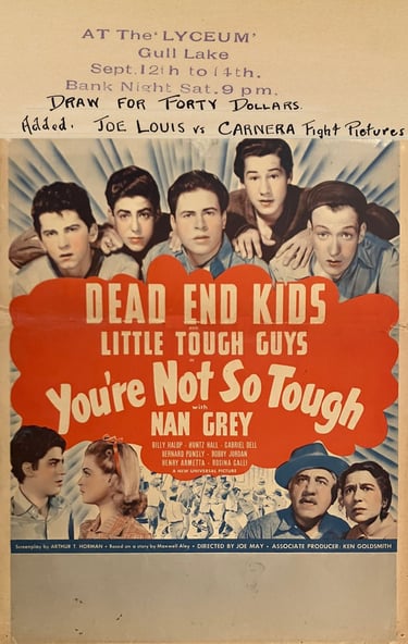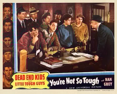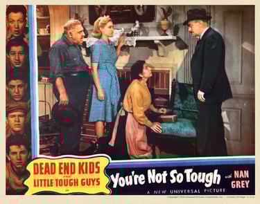 The rare 1940 double-bill release ("Plus second action thriller!") of You're Not So Tough, the 1940 Joe May New York City juvenile delinquent crime thriller starring The Dead End Kids and The Little Tough Guys (before this, some of the Dead End Kids had split off into a separate group called "The Little Tough Guys", but they joined back together for this movie; including Billy Halop, Huntz Hall, Bobby Jordan, and Gabriel Dell), Nan Grey, Bernard Punsly, Henry Armetta, Rosina Galli AND Lucky Cisco Kid, the 1940 H. Bruce Humberstone cowboy western ("A rival bandit steals his name! A crooked judge frames him! A senorita crosses him up!"; "Based on the character 'The Cisco Kid' created by O. Henry") starring Cesar Romero (in the title role as The Cisco Kid), Mary Beth Hughes, Dana Andrews, Evelyn Venable, and Chris-Pin Martin.