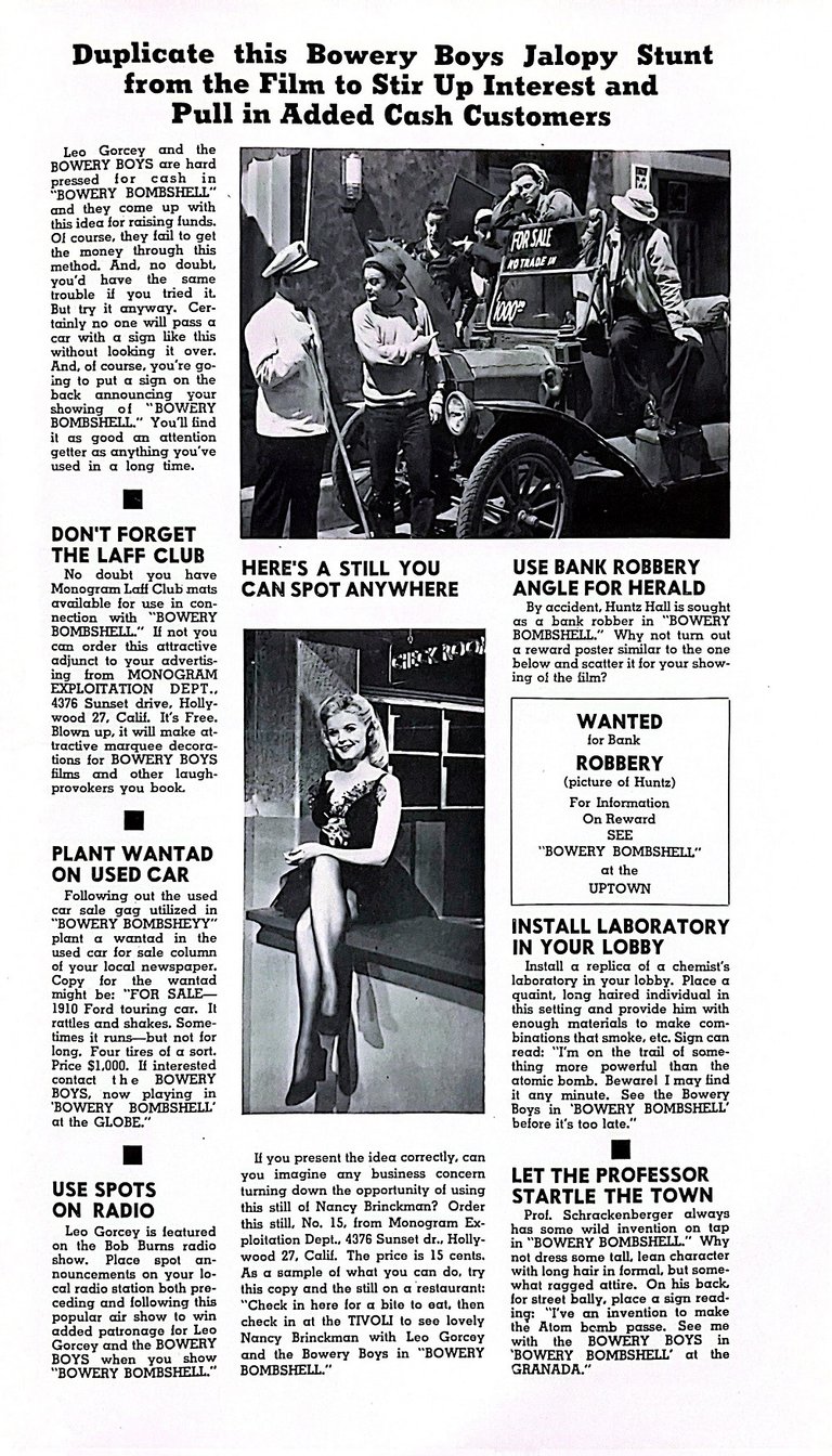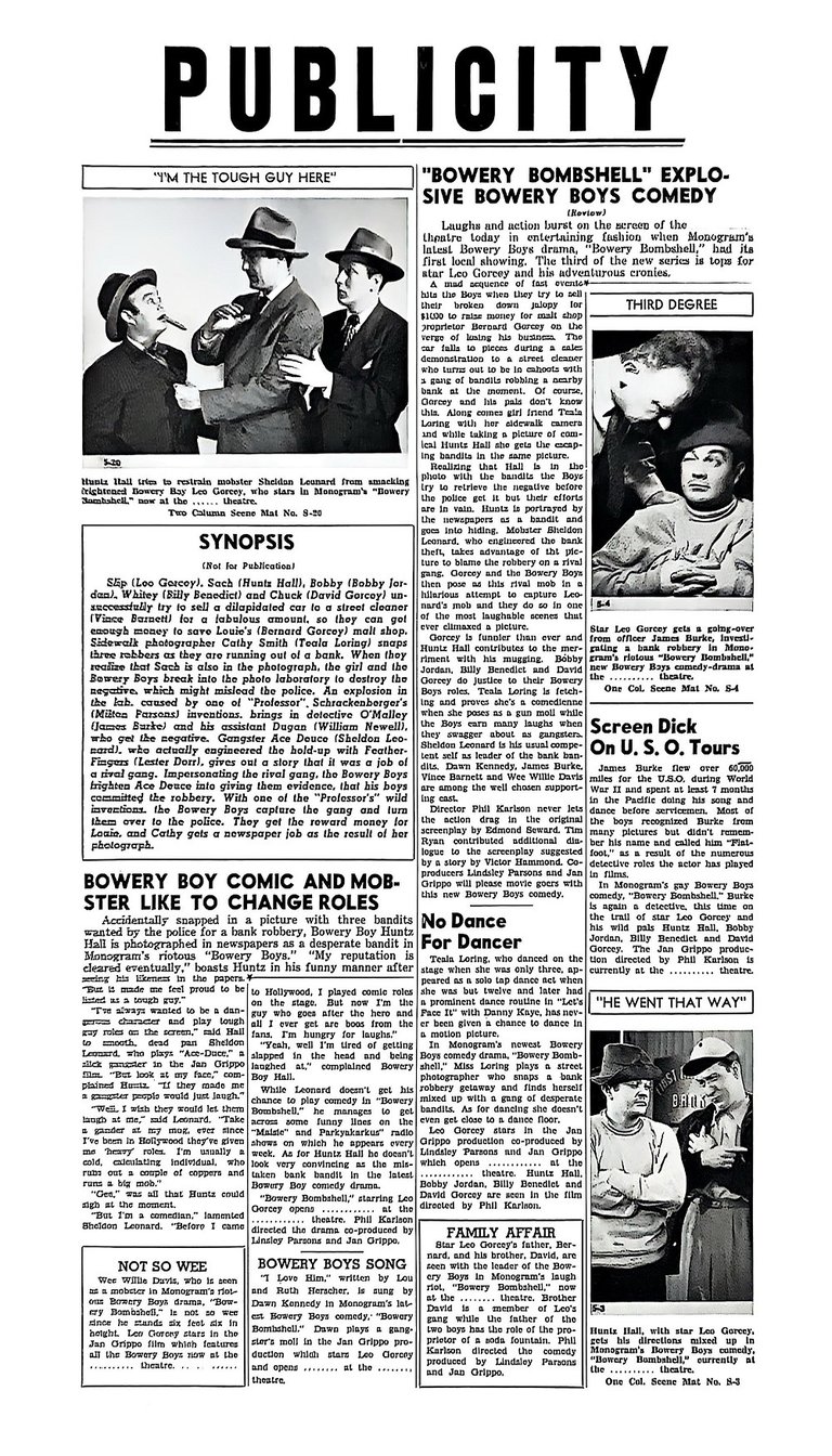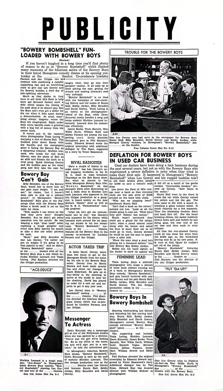 First Bowery Boys film with former East Side Kid Buddy Gorman. He only has a small cameo as 'Bud' (the newsboy) but would become a regular member of the gang beginning with the film Blonde Dynamite.