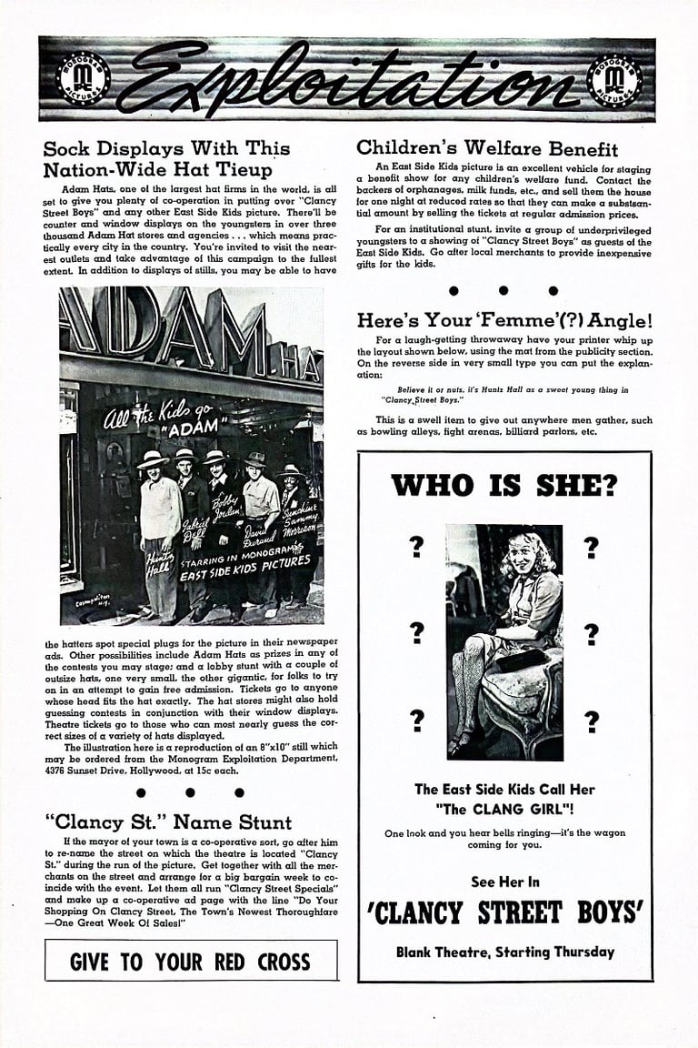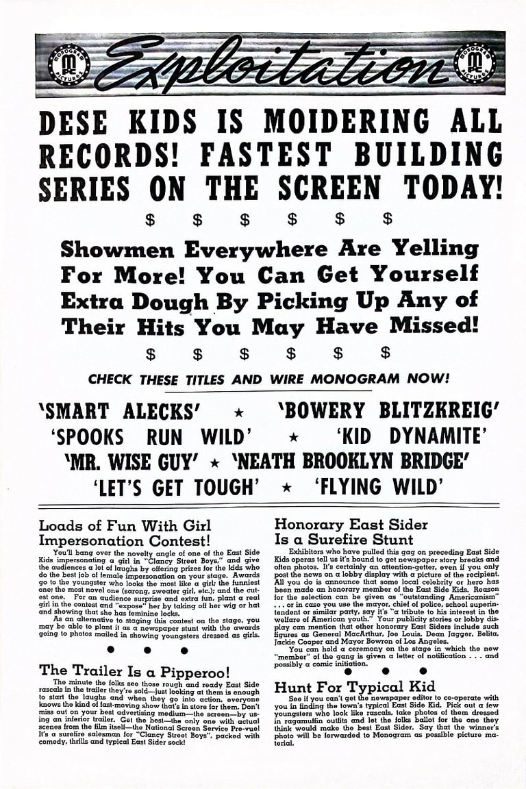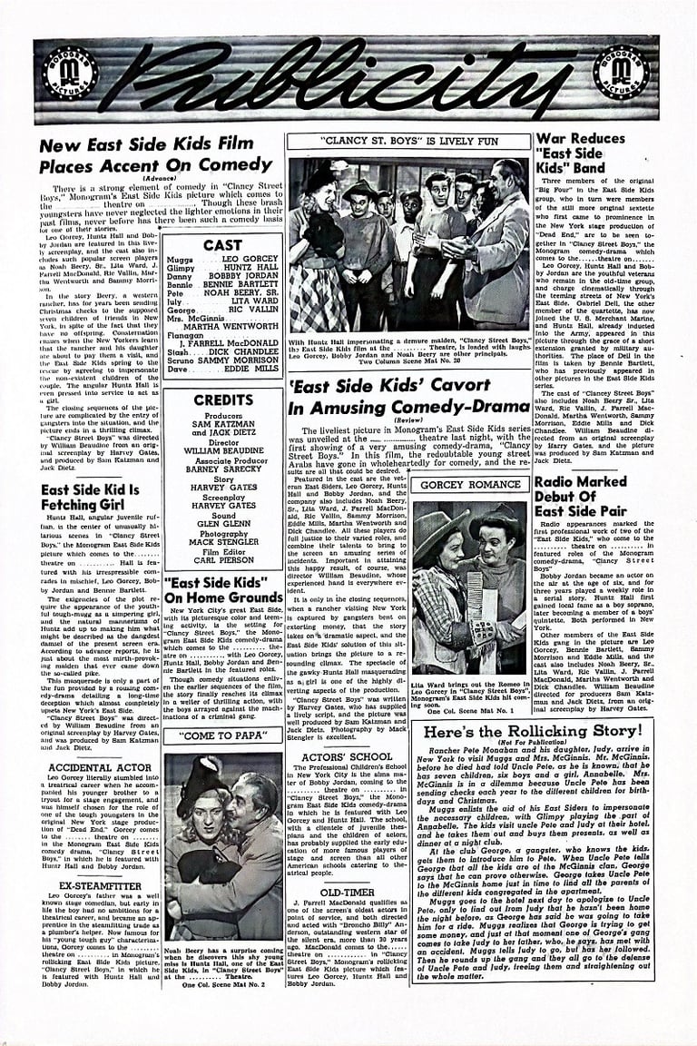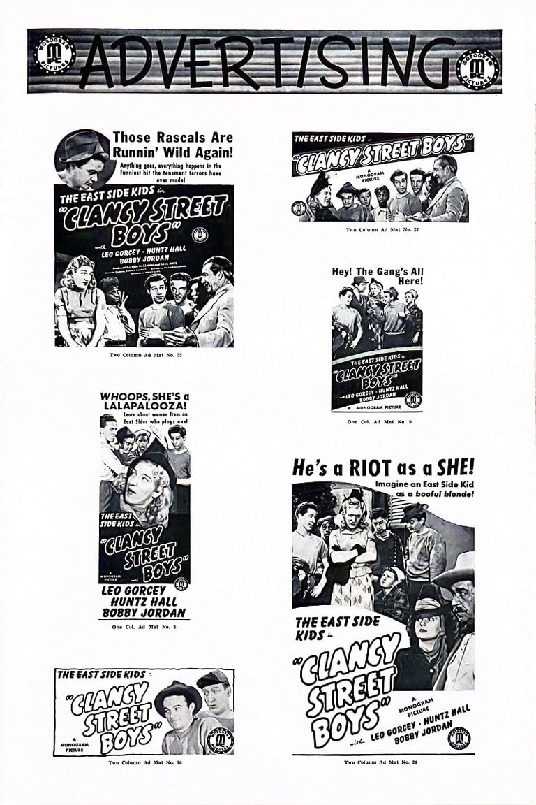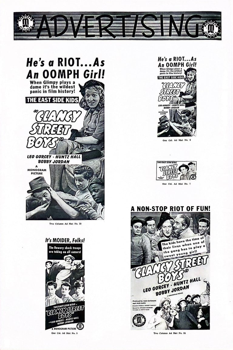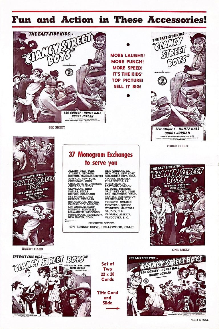 Clancy Street Boys is a 1943 comedy film directed by William Beaudine and starring the East Side Kids. It is Beaudine's first film with the team; he would direct several more in the series and many in the Bowery Boys canon. Leo Gorcey married the female lead Amelita Ward. There is no mention of "Clancy Street" in the film, but a rival gang at Cherry Street appears at the beginning and climax of the film.