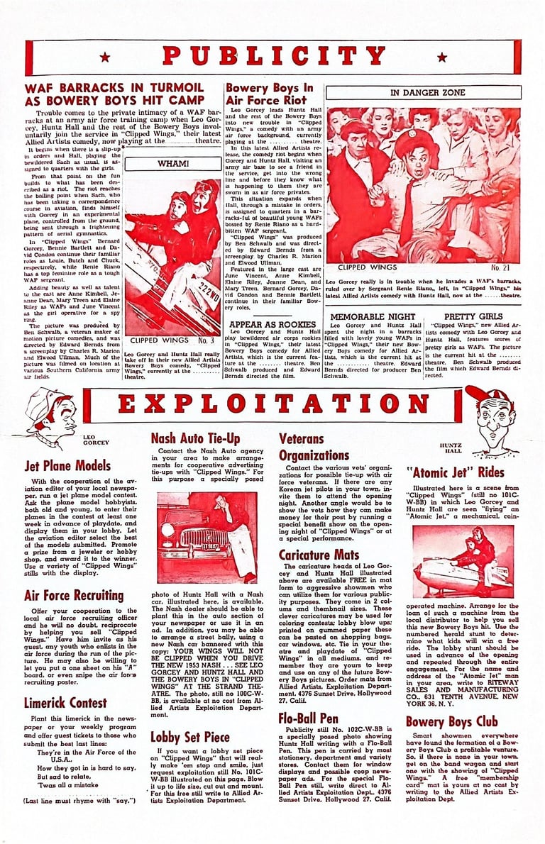 In a prime example of product placement the "Atomic Jet" amusement coin-operated ride from Nat Cohn's Riteway Sales that appeared in the film and advertising material was offered to be installed in every theatre that showed Clipped Wings.