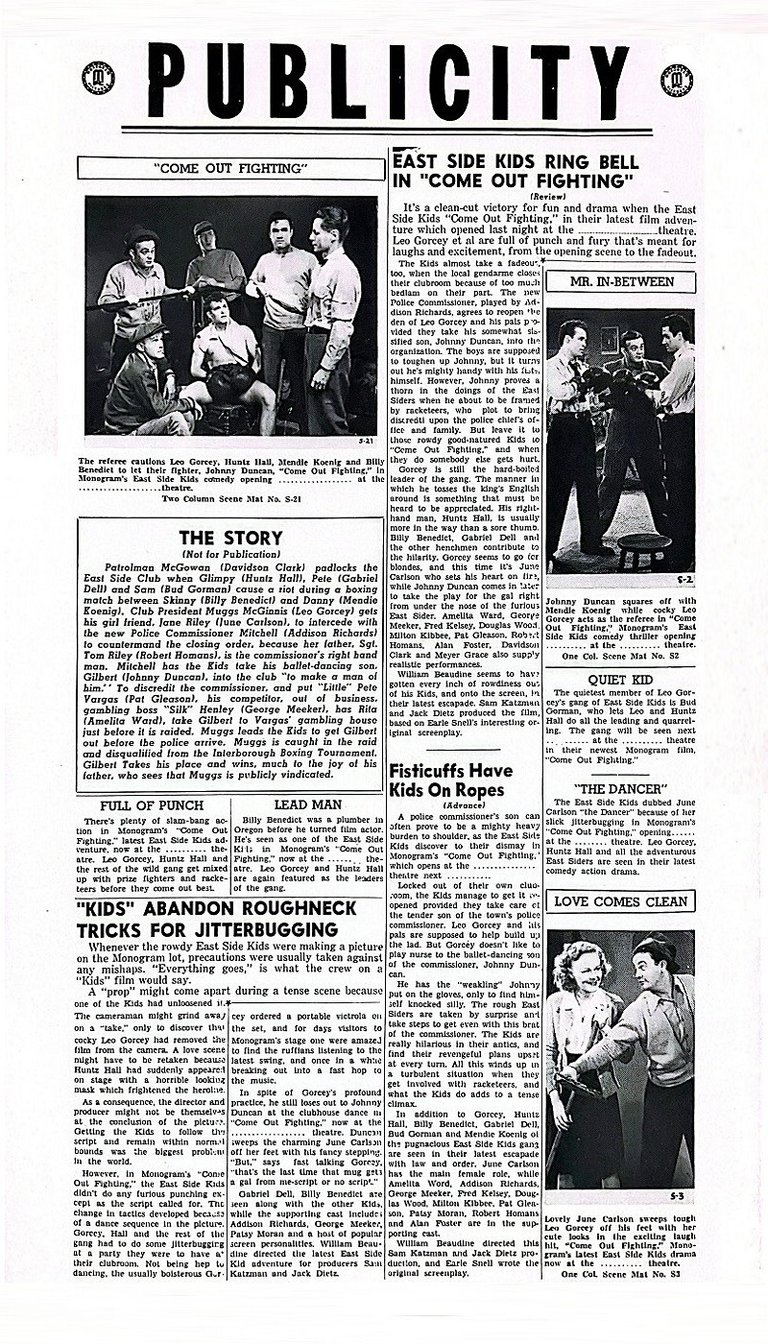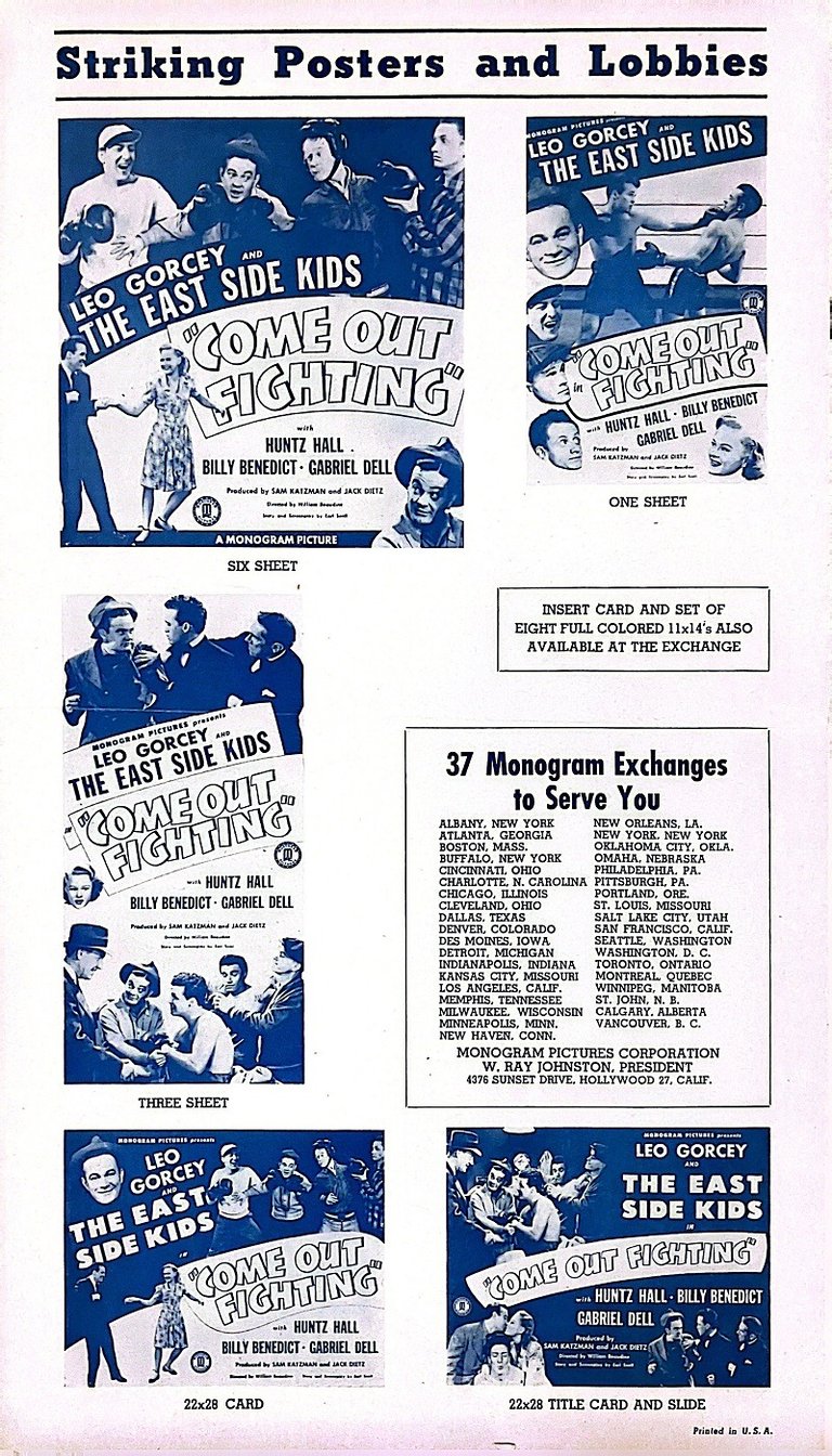 Come Out Fighting is a 1945 American film directed by William Beaudine. It was the last in the Monogram Pictures series of "East Side Kids" films before the series was reinvented as "The Bowery Boys. Film critic Leonard Maltin described the film as "grating," giving it one and a half out of four stars.