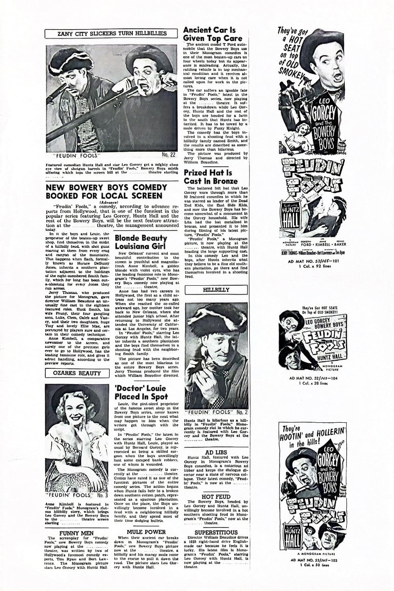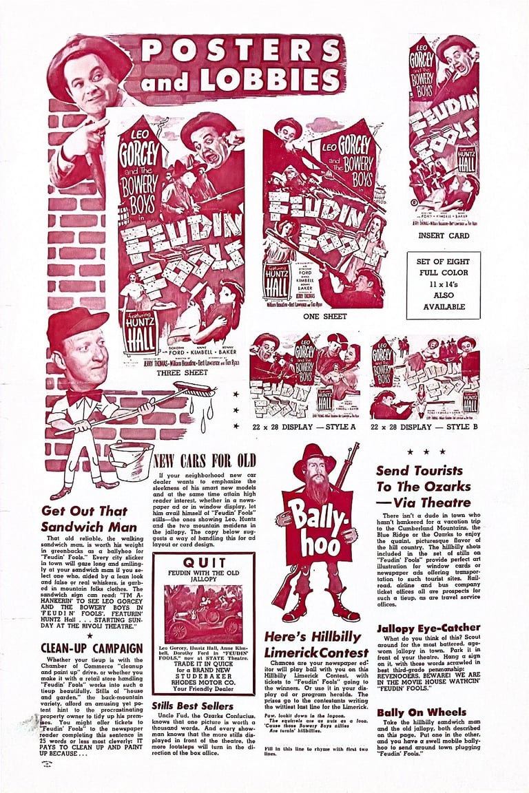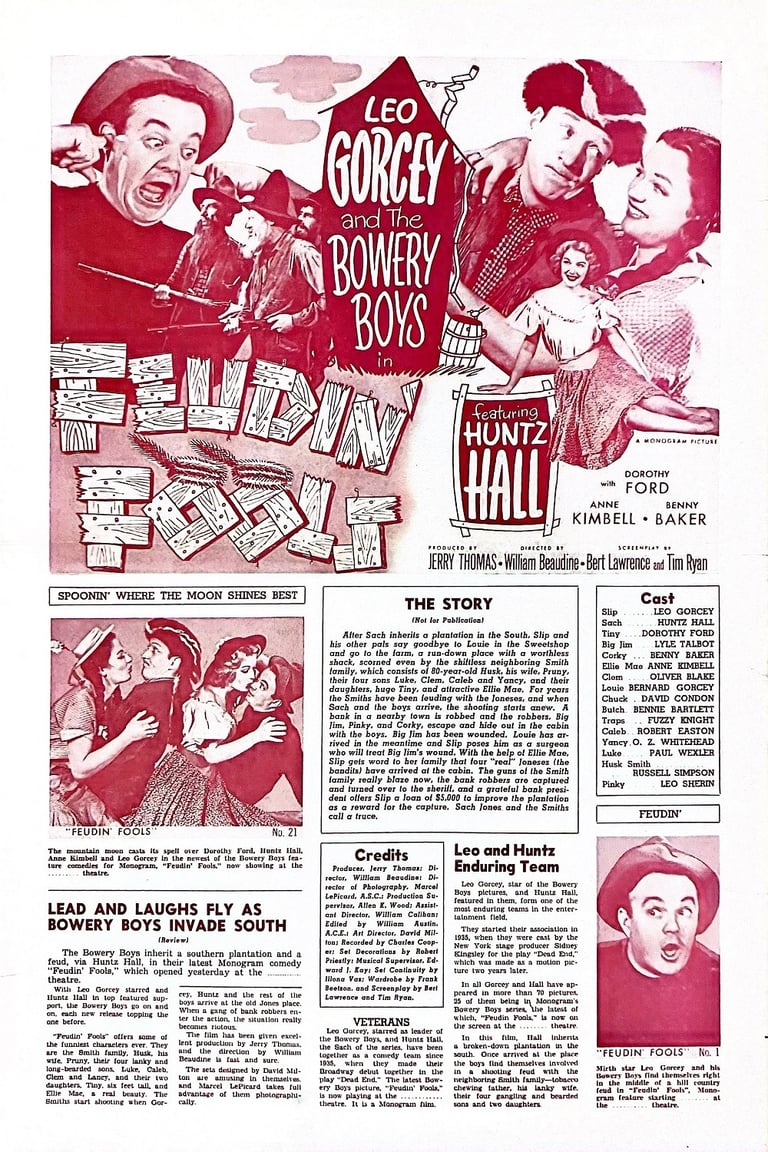 Feudin' Fools is a 1952 American comedy film directed by William Beaudine and starring The Bowery Boys, Anne Kimbell and Dorothy Ford. The film was released on September 21, 1952 by Monogram Pictures and is the twenty-seventh film in the series.