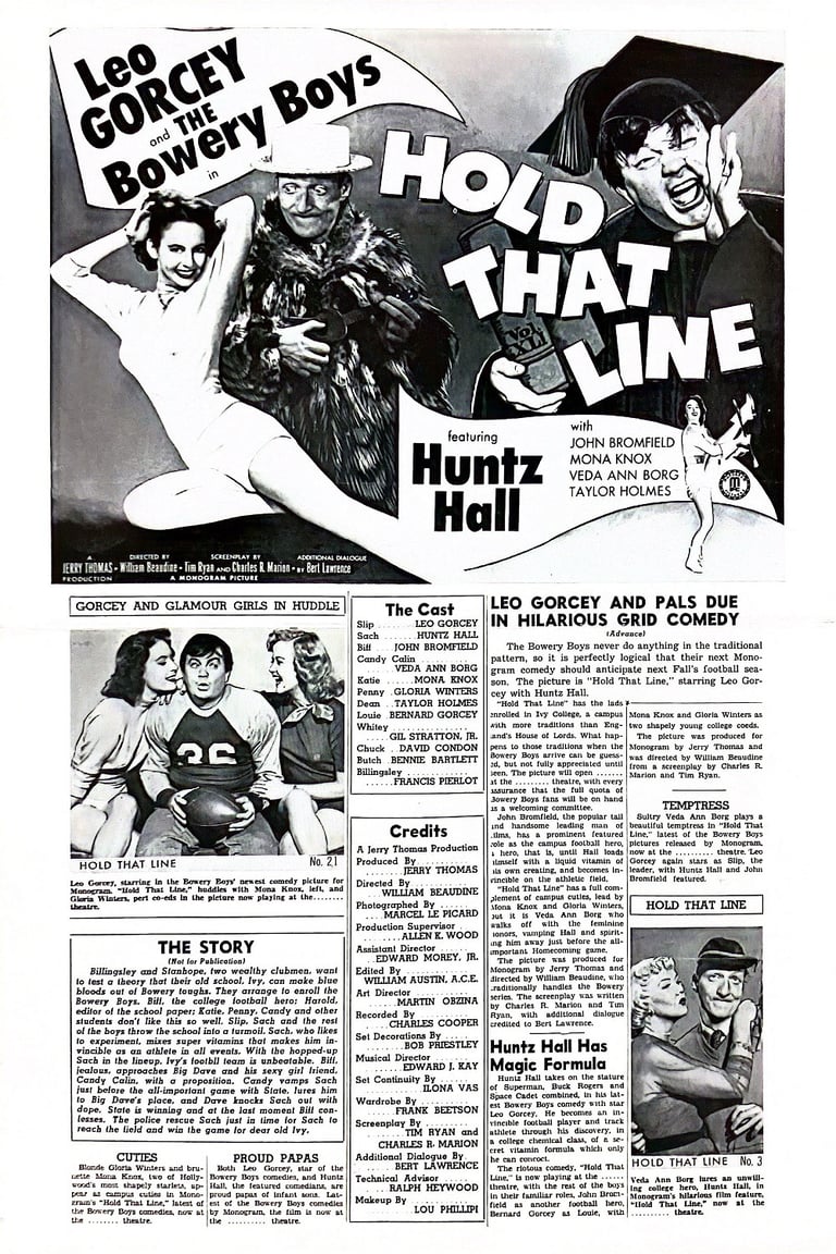Hold That Line is a 1952 American comedy film directed by William Beaudine and starring the Bowery Boys, Veda Ann Borg and Gloria Winters. The film was released on March 23, 1952 by Monogram Pictures and is the 25th film in the series.