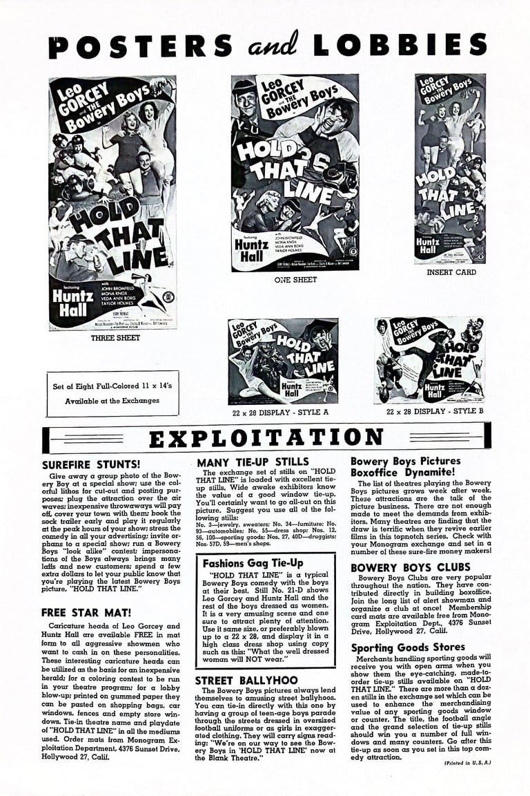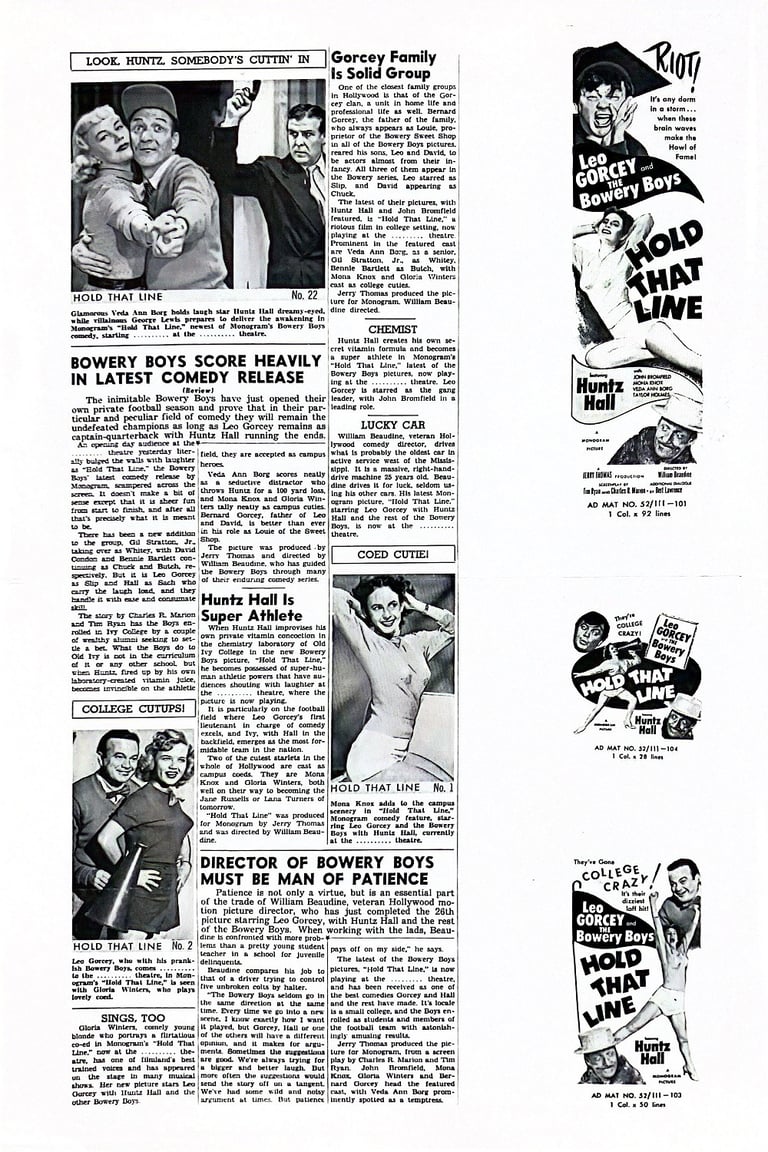 Director William Beaudine captured the college-campus and football elements of Hold That Line so well that Monogram hired him to film a more elaborate gridiron picture, The Rose Bowl Story, that same season.