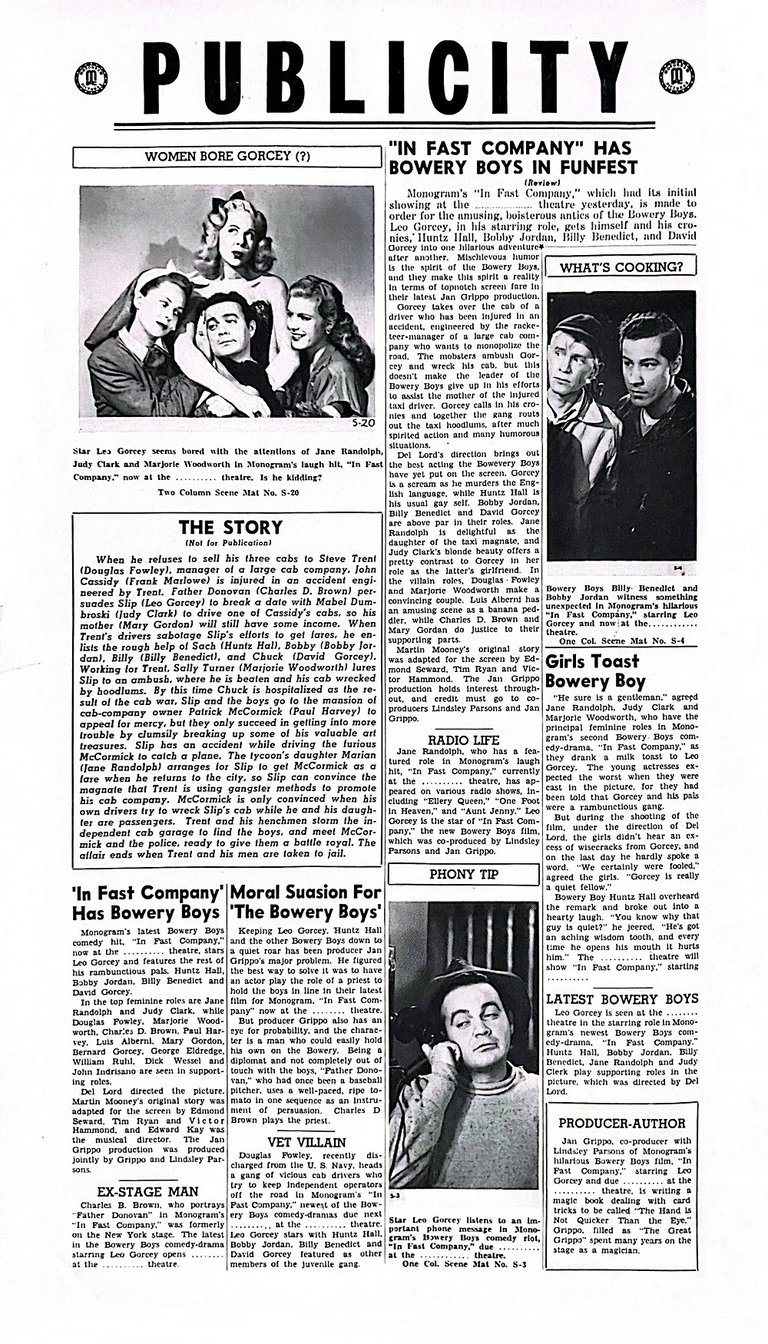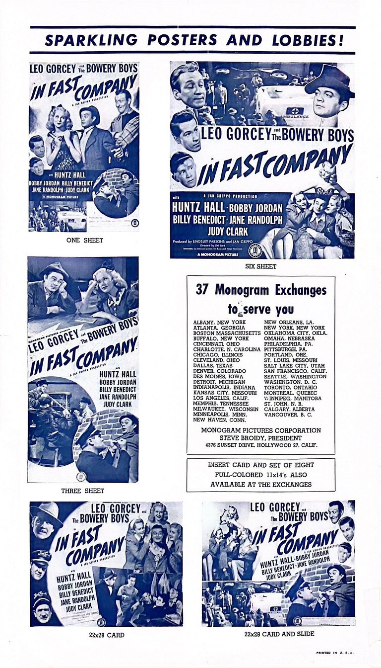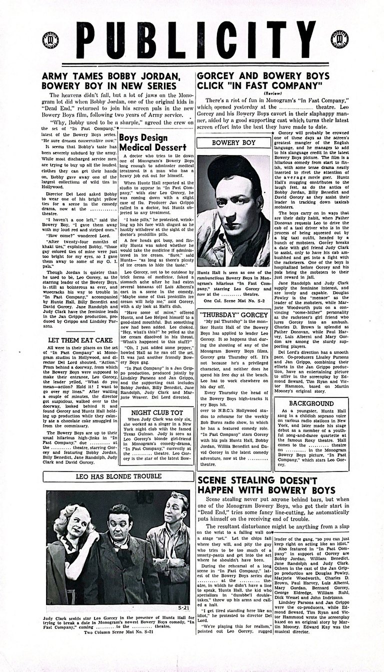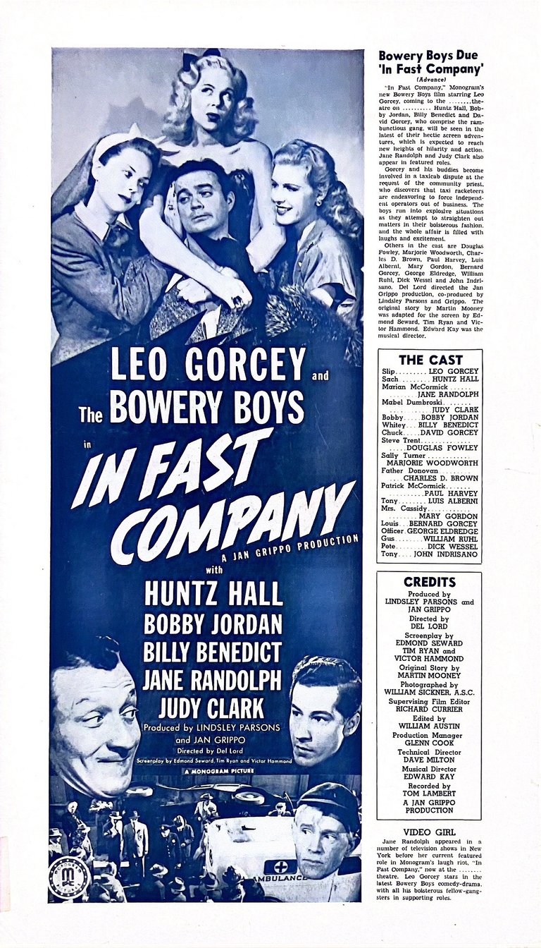 In Fast Company is a 1946 American comedy film directed by Del Lord starring the comedy team of The Bowery Boys alongside Jane Randolph and Judy Clark. It is the second film in the series, which was produced by Monogram Pictures.