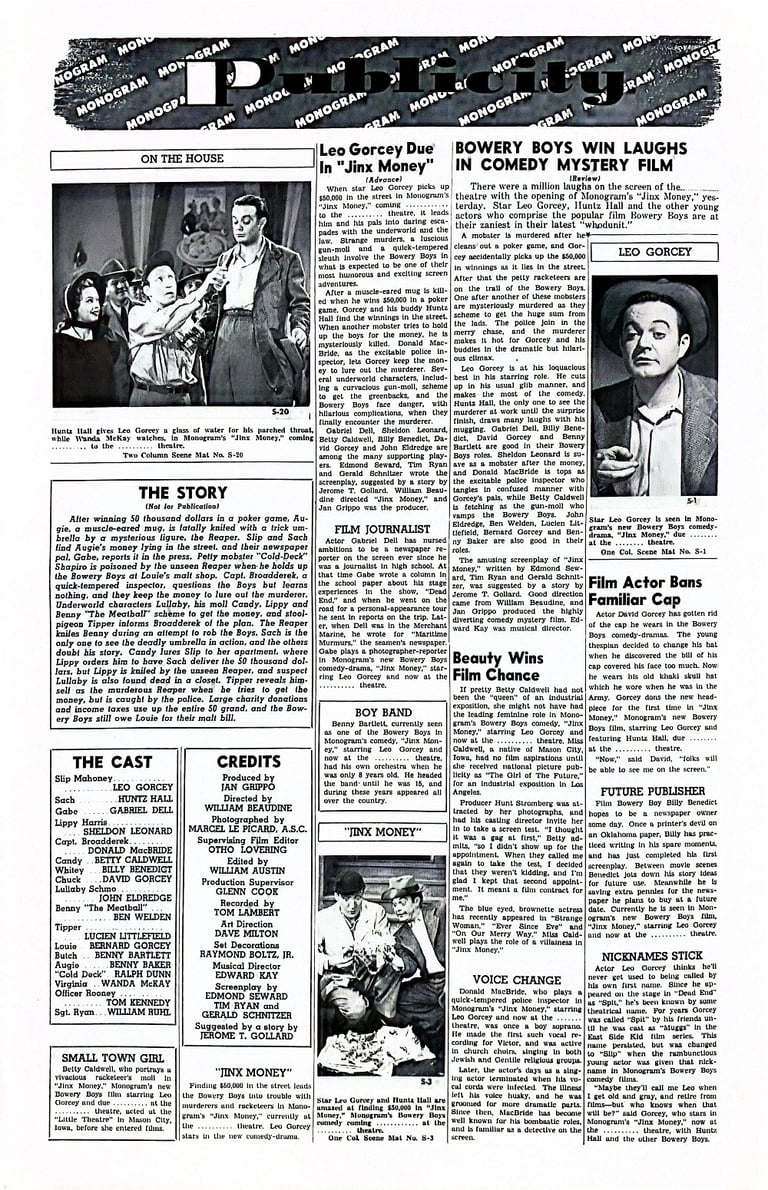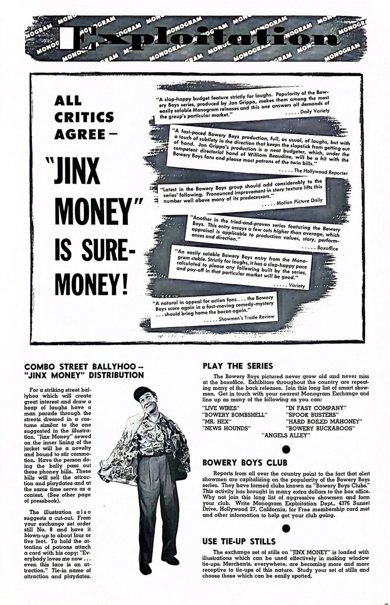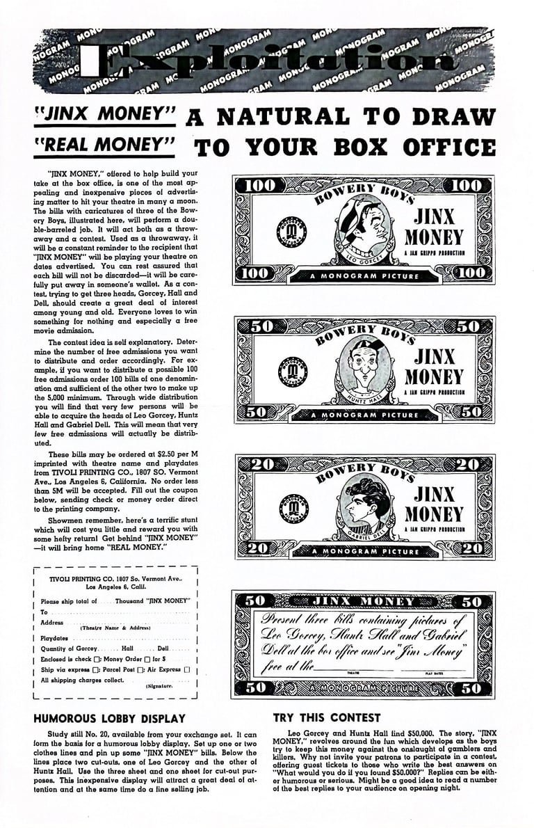 Jinx Money is a 1948 American comedy film directed by William Beaudine and starring the comedy team of The Bowery Boys. It is the tenth film in the series and the first one to include Bennie Bartlett as part of the team.