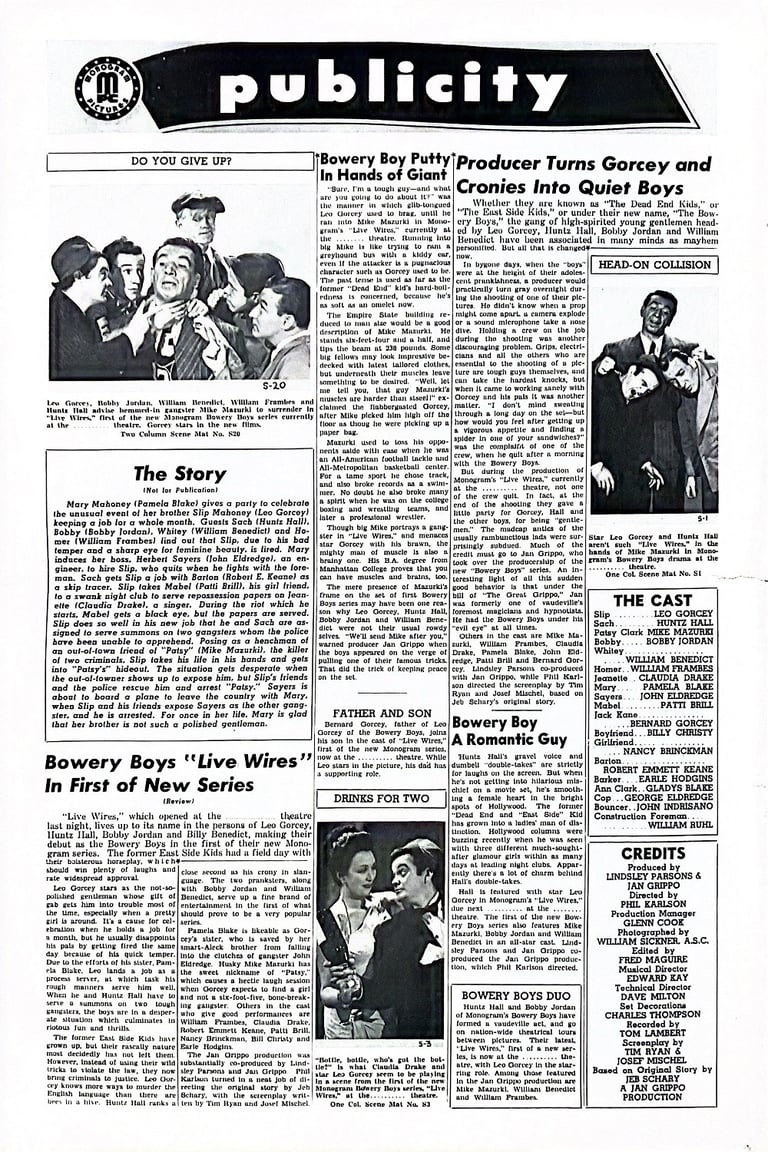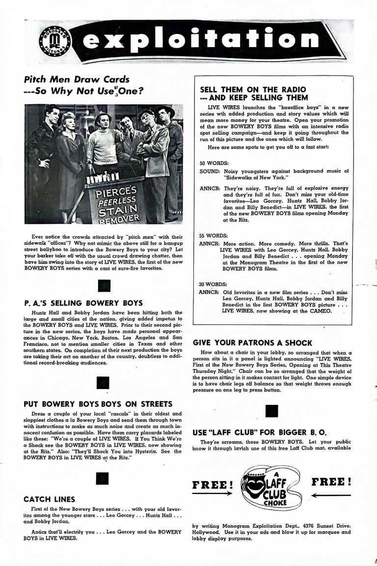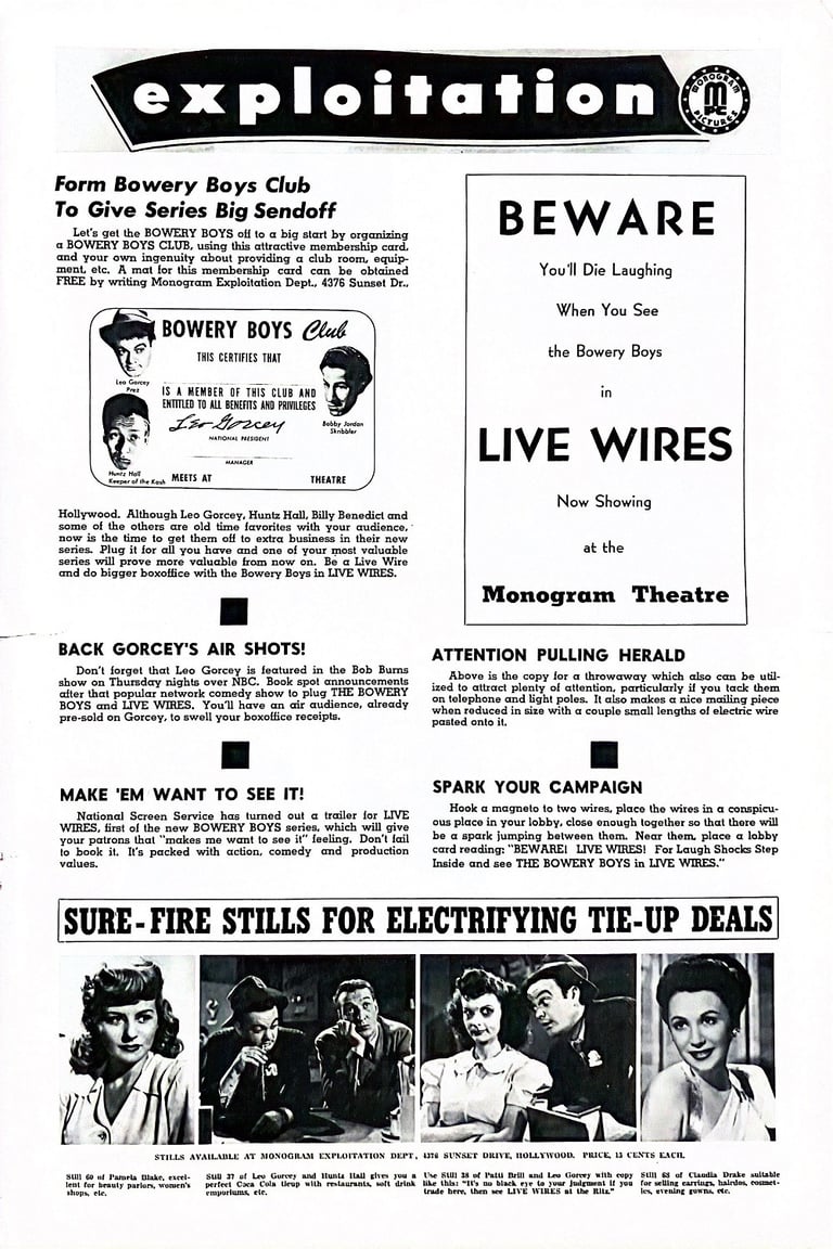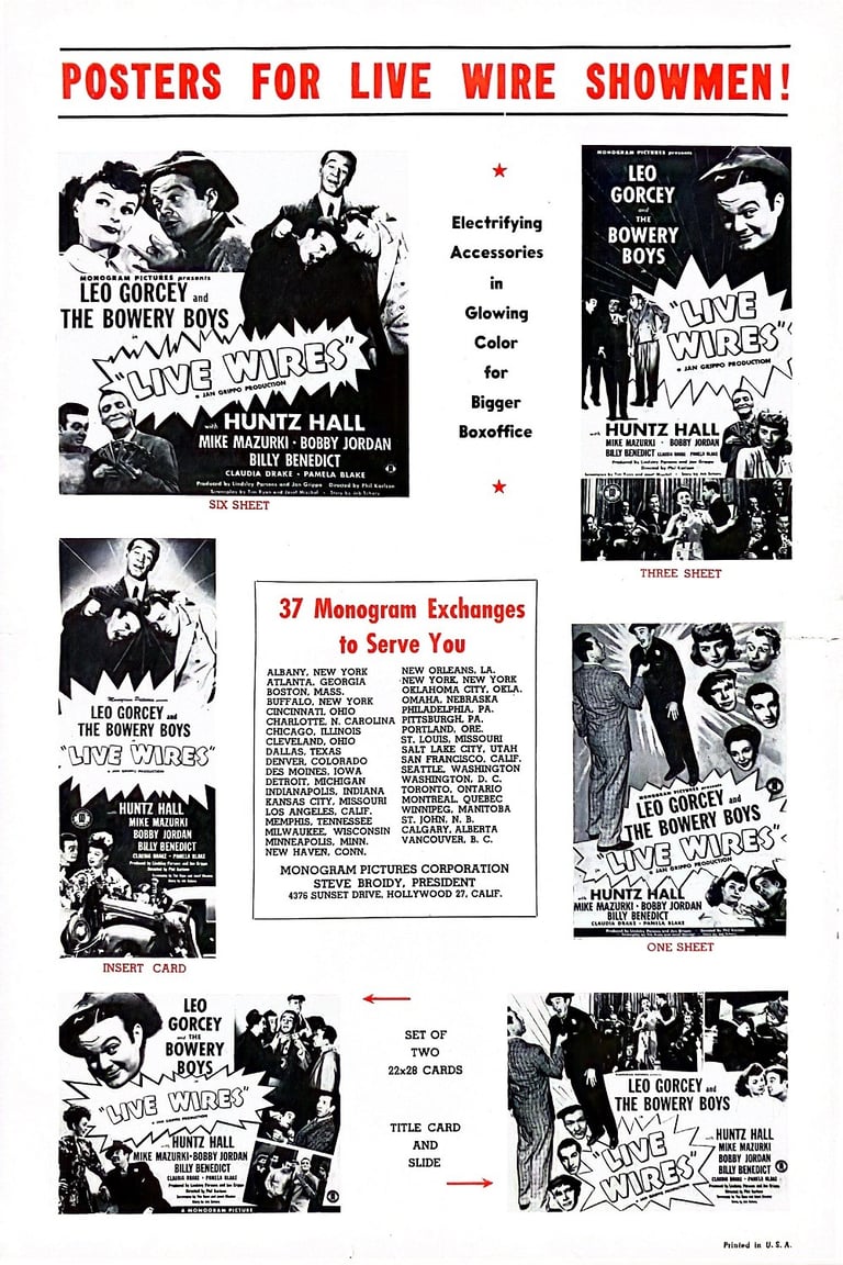 Live Wires is a 1946 film starring the comedy team of The Bowery Boys. It is the first film in the series, which lasted until 1958 and included forty-eight films, after the comedy team of the East Side Kids was revamped and renamed The Bowery Boys.