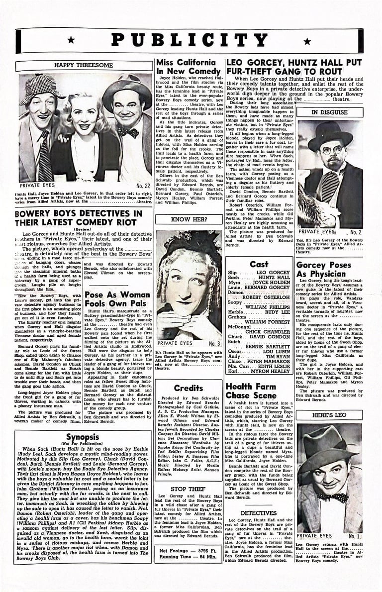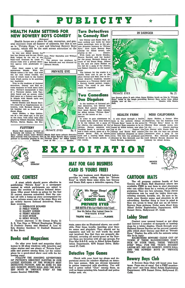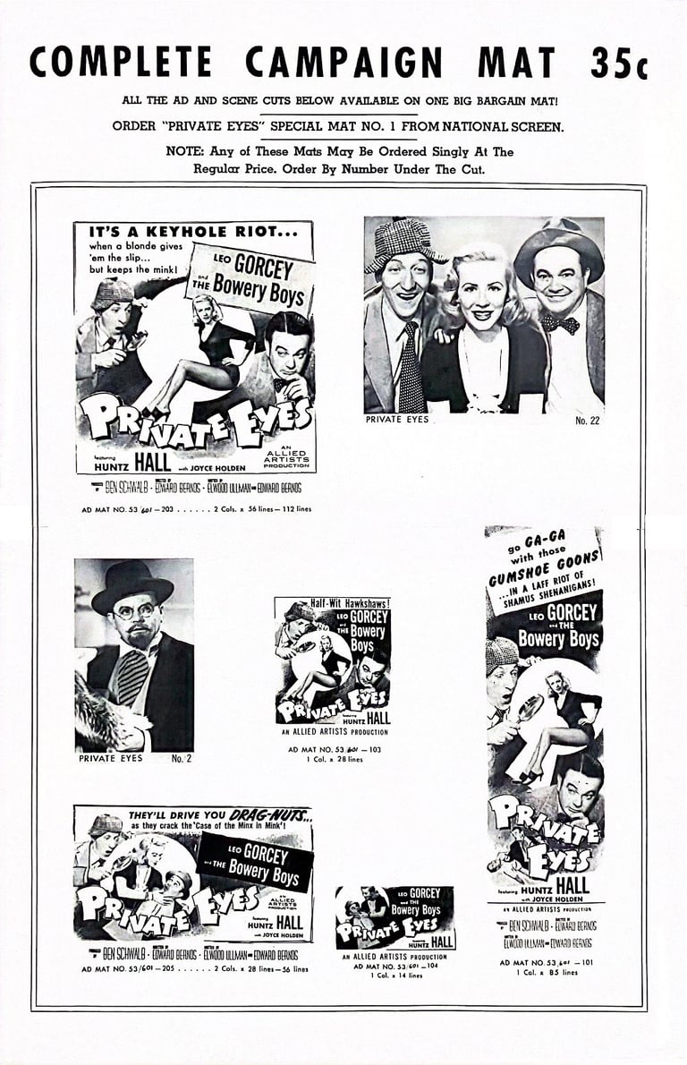 Private Eyes is a 1953 comedy film starring The Bowery Boys. The film was released on December 6, 1953, by Allied Artists and is the thirty-second film in the series.