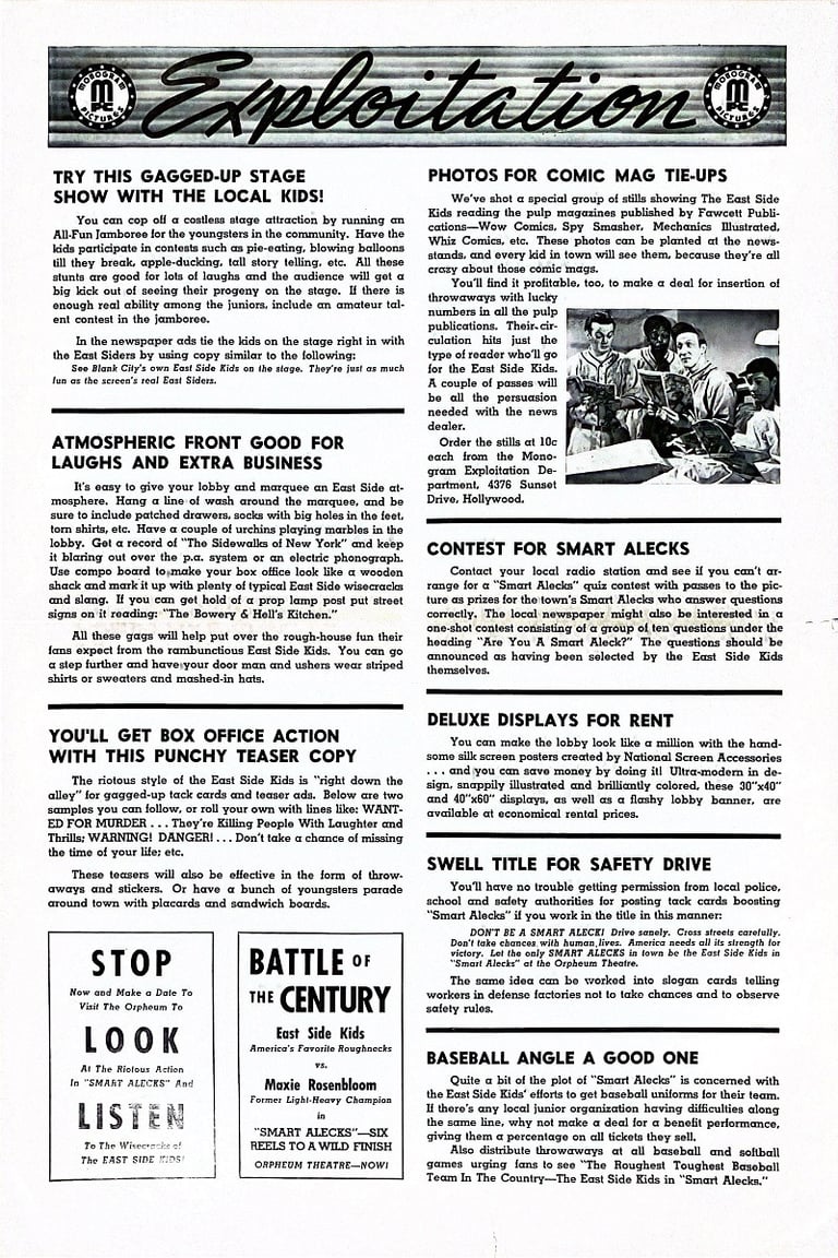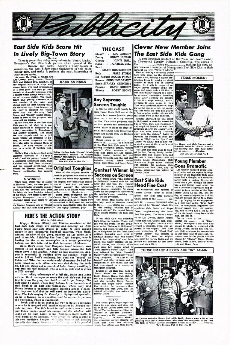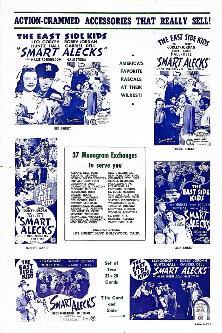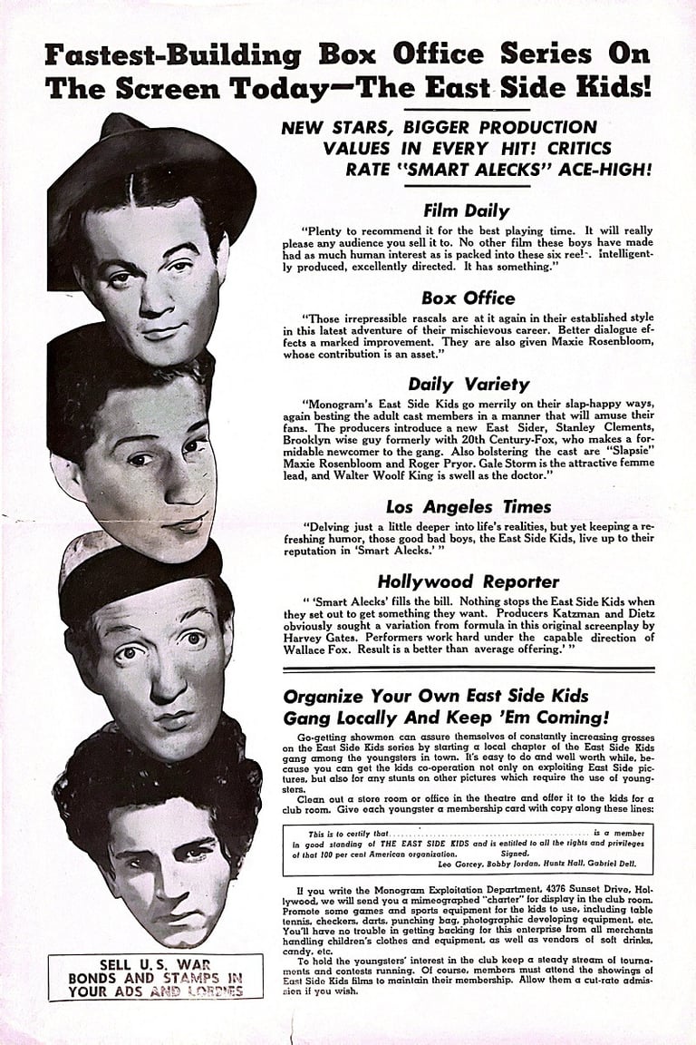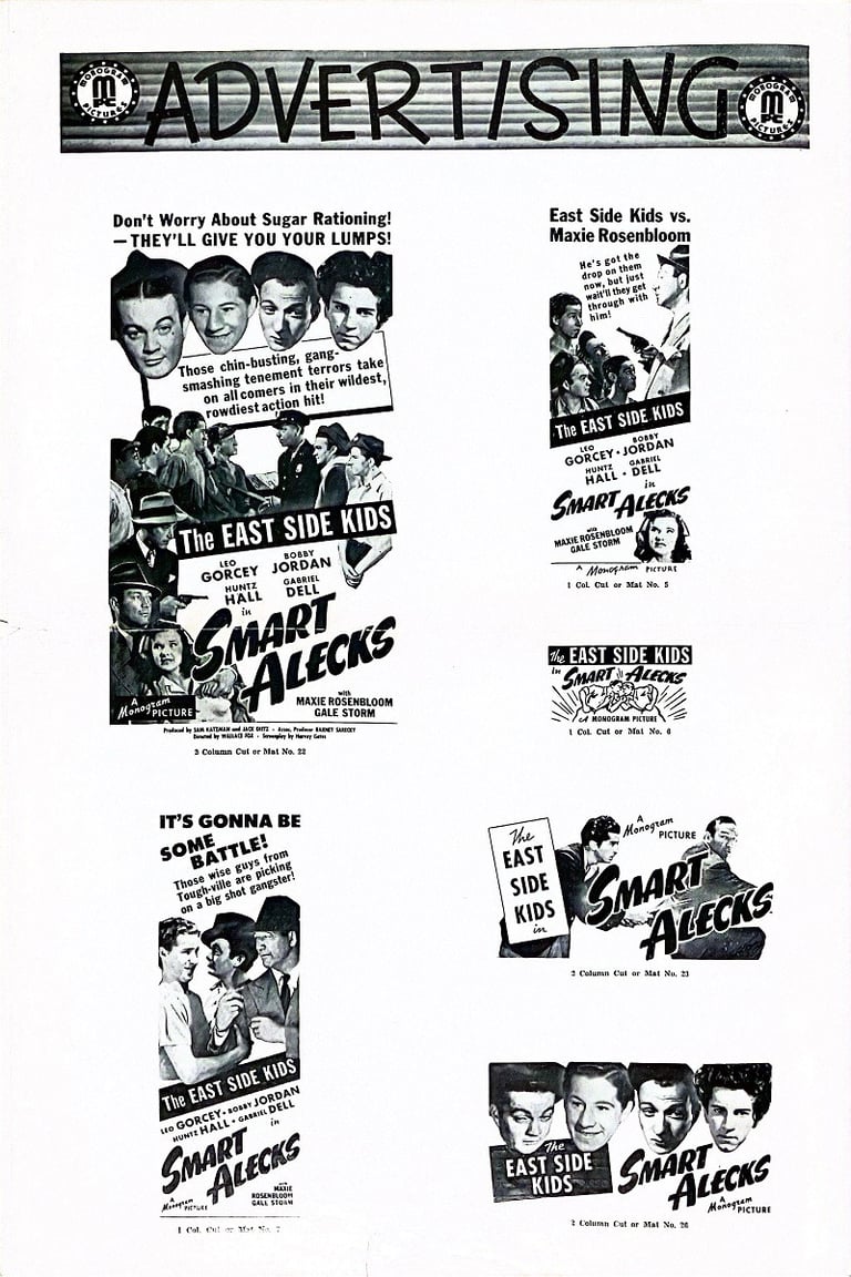 Smart Alecks is a 1942 American film directed by Wallace Fox and starring the East Side Kids. Stanley Clements is given an "Introducing" credit. In the film he irritates Muggs by imitating him; Clements later replaced Leo Gorcey as leader of the gang when Gorcey left the Bowery Boys series. Clements' character inexplicably vanishes during moments of the film.